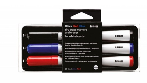 Zestaw do tablic magnetycznychzawiera 3 markery oraz gąbkę do ścierania.