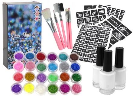 Zestaw do Tatuażu Brokaty Klej Pędzelki 187 Wzorów Prezentujemy Duży Zestaw do Robienia Tatuaży, stworzony z myślą o dzieciach, które uwielbiają tworzyć i wyrażać swoją kreatywność w unikatowy sposób! Ten zestaw nie tylko dostarcza rozrywki, ale także otwiera drzwi do fascynującego świata artystycznych przygód dla najmłodszych. Zestaw ten to doskonała propozycja na wszelkiego rodzaju imprezy dla dzieci, od urodzin po rodzinne spotkania. Trwałe tatuaże, jakie można stworzyć za pomocą tego zestawu, stają się nie tylko artystyczną ozdobą, ale także formą wyrażania własnej wyjątkowości i stylu. Proces tworzenia tatuaży jest niezwykle prosty i bezpieczny. Wybierz ulubiony wzór spośród bogatej kolekcji szablonów, nałóż delikatnie klej na wybrane miejsce, a następnie przy użyciu pędzelka dokładaj kolorowy brokat, tworząc efektowne kompozycje. Możesz korzystać z różnych kolorów, dodając do swoich tatuaży mnóstwo różnorodności. Zestaw obejmuje wszystkie niezbędne elementy do zabawy, w tym szablony, klej, kolorowe brokaty i pędzelki. Daj dzieciom na wspaniałą przygodę z kreatywnością i radością, oferując im Duży Zestaw do Robienia Tatuaży. To nie tylko świetna zabawa, to magiczna brama do świata sztuki, gdzie każdy może być małym artystą i twórcą swoich niepowtarzalnych dzieł! Zestaw zawiera: -187 szablonów -24 brokaty -3 kleje -5 pędzelków Wymiary opakowania: 22cm x 12cm x 6cm Posiada certyfikat CE, ponadto jest zgodny z normą EN71. Przeznaczony dla dzieci powyżej 5 roku życia.