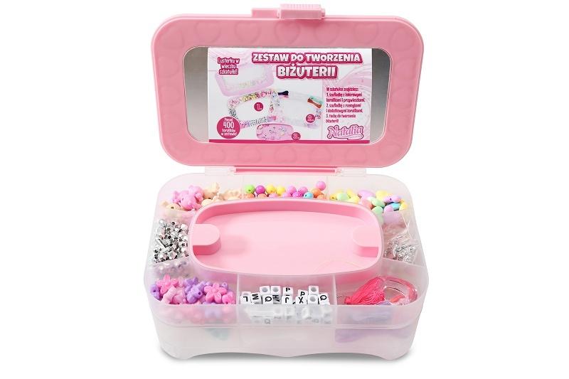 W zestawie: ponad 400 koralików do tworzenia biżuterii, rzemyki, walizeczka posiada plastikowe lusterko oraz przegródki, wym. opk: 19 cm x 13,5 cm x 8 cm, 6++