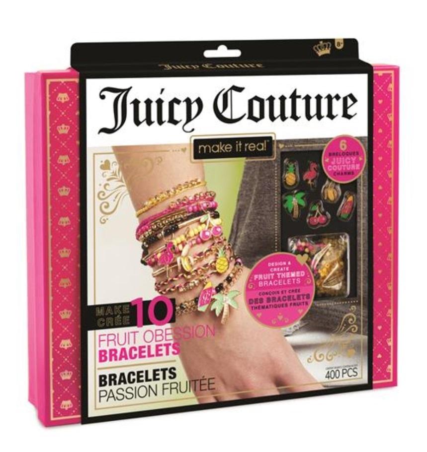 Różowe pudełko z zachwycającym zdobieniem skrywa w swoim wnętrzu wiele niesamowitych elementów, które pozwolą na stworzenie niebanalnych błyskotek. Znajdziesz tam sześć owocowych charmsów Juicy Couture, 350 wielokolorowych koralików, bawełniane, nylonowe oraz elastyczne tasiemki, łańcuszek, 40 metalowych detali oraz bazę bransoletki w złotym kolorze. Zestaw pozwala na stworzenie aż 10 wyjątkowych bransoletek.