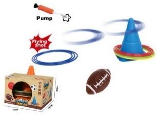 Zestaw do zabawy na powietrzu: słupek, dyski, piłka rugby, pompka color box 16x16x11cm