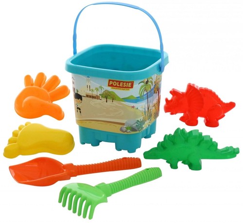 Zestaw do zabawy nw piasku: wiaderko-zamek duże z nalepką, łopata Nr6, grabki Nr6, foremki (dłoń + nóżka + dinozaur Nr1 + dinozaur Nr2) Dla dzieci od 1 roku życia