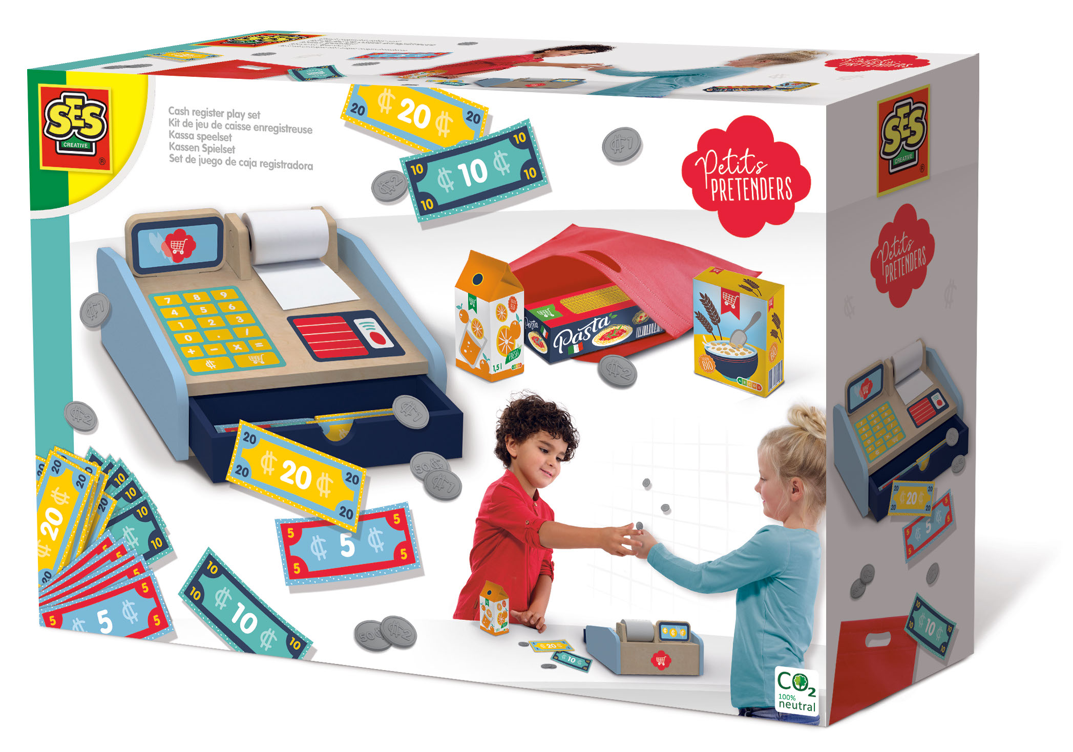 Zamień swój kącik zabaw w prawdziwy supermarket dzięki tej drewnianej kasie i artykułom sklepowym. Czy w kolejce są już klienci, którzy chcieliby zapłacić? Nie ma problemu, w kasie masz wystarczająco dużo monet i rachunków, aby oddać resztę. Czy klient chciałby do niego zakupić torbę na zakupy lub paragon? Nie ma problemu! Dobrze komponuje się również z innymi produktami sklepowymi i kulinarnymi z kolekcji Petits.