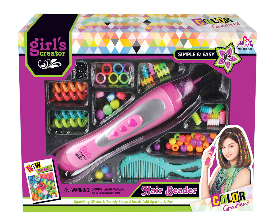 Zestaw do zaplatania włosów zawiera: maszynkę do nawlekania koralików, koraliki oraz grzebień.