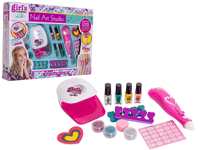 Zestaw do stylizacji paznokci, który fantastycznie uzupełni spotkania z koleżankami.2 separatory do stóp,pilniczek do paznokci w kształcie serca,4 lakiery do paznokci (usuwanie bez użycia zmywacza) dekoracyjne naklejki na paznokcie,4 kolory brokatususzarka do paznokci z wentylatorkiem (zasilana na baterie) pisak do nakładania brokatu. Aby usunąć lakier z paznokci wystarczy go oderwać, nie wymaga użycia zmywacza do paznokci.zasilanie suszarka 2xAA, pisak xxAAA (brak w zestawie)