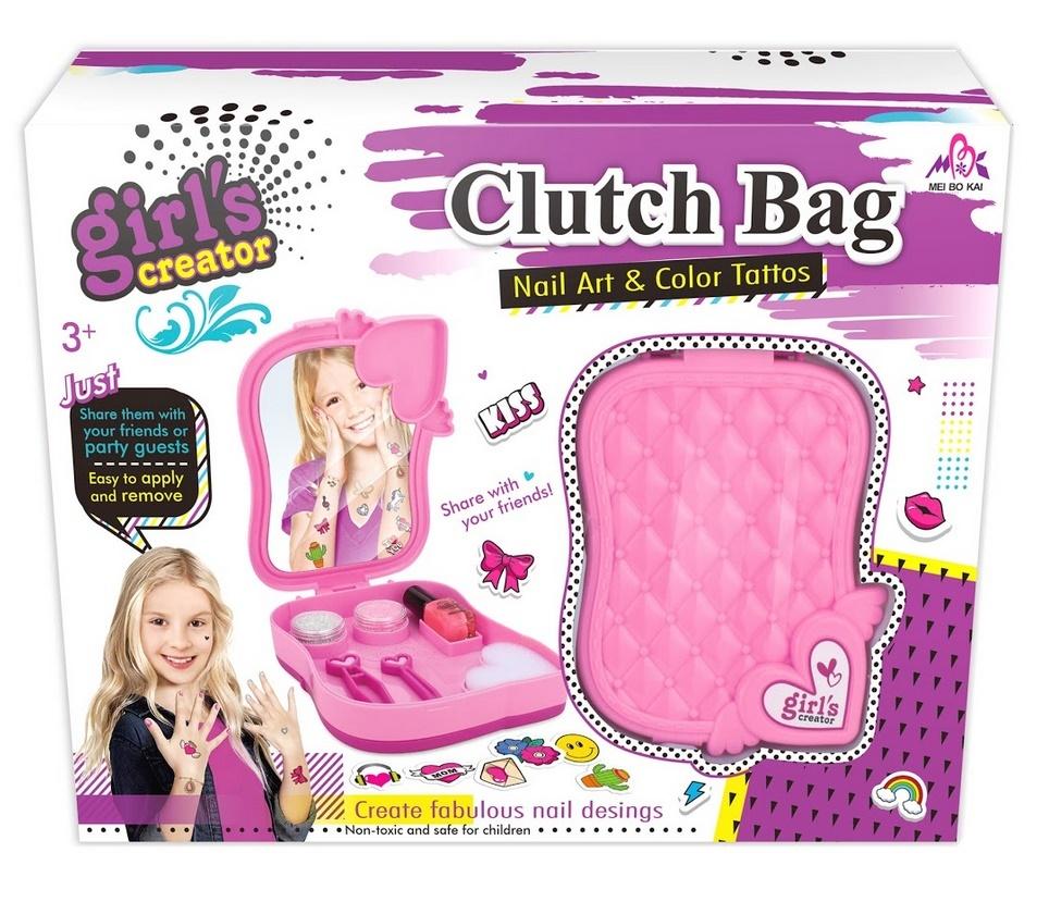 w zestawie pudełko do przechowywania z lusterkiem, lakier do paznokci (łatwy do zdejmowania), brokat, penseta, gąbeczka, naklejki na paznokcie, tatuaże