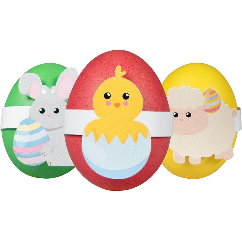 Zestaw do dekoracji pisanek. W zestawie barwniki w 3 kolorach oraz papierowe wzory na jajka. Kolory barwników: żółty, czerwony, zielony. Gotowy zestaw do zrobienia zabawnych pisanek. Sposób użycia produktu znajduje się na opakowaniu. Barwniki są przeznaczone wyłącznie do barwienia jaj.