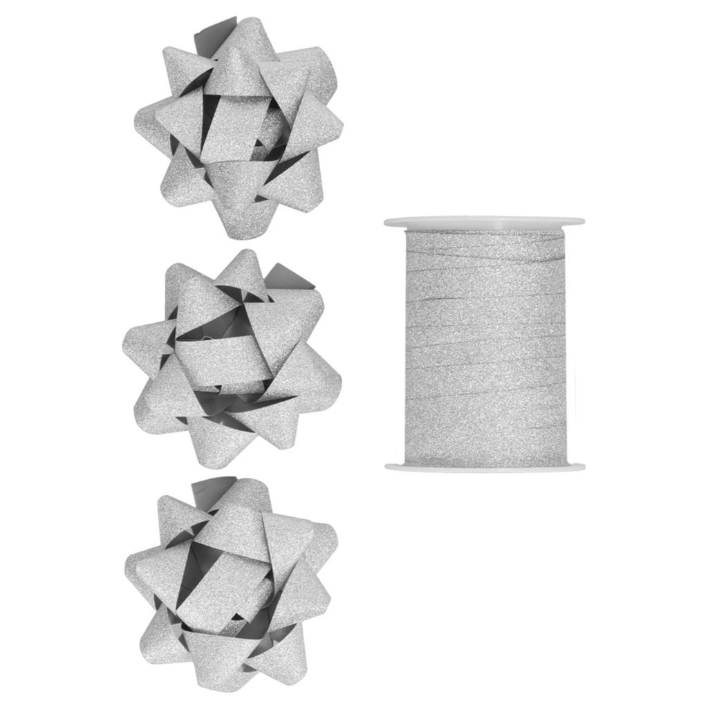 Zestaw akcesoriow do pakowania prezentów. Brokatowo srebrna kolorystyka pomoże nadać prezentom wyjątkowej oprawy bardzo elegancki i gustowny zapakowany w pudełko pvc na zestaw składa się: wstążki 1cmx10m oraz 3 rozetk