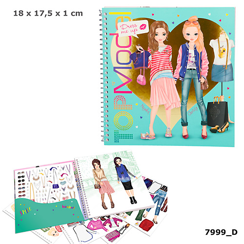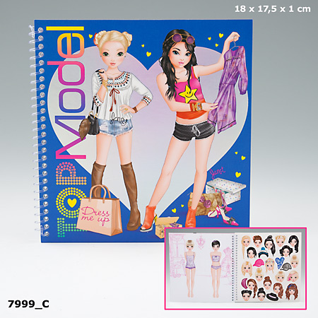 Zestaw Dress Me Up Top Model z naklejkami, 12 dwustronnie zadrukowanych kartek z modelkami oraz 11 stron z naklejkami (głowami, ubraniami i dodatkami). Wymiary jak na zdjęciu.