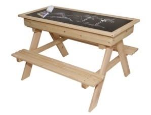 Drewniany zestaw ogrodowy zawierający stolik + 2 ławeczki oraz pojemnik/schowek/piaskownicę. Przykrycie to jednostronna tablica. Zestaw zawiera kredę oraz gąbkę.