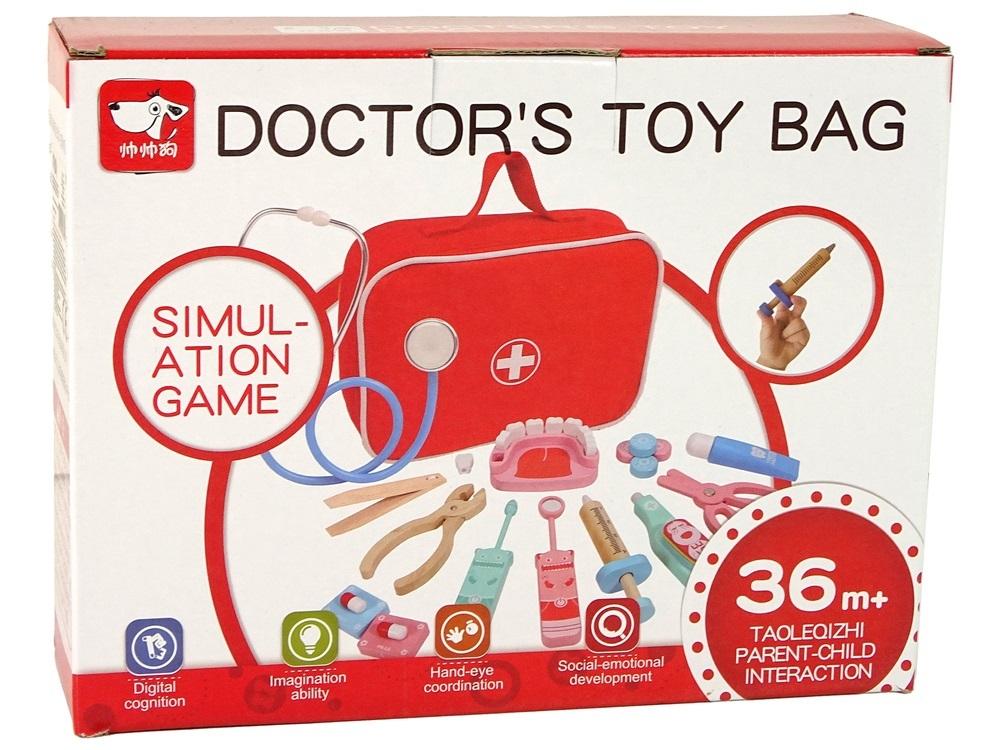 W zestawie znajduje się wiele drewnianych narzędzi, które pozwalają dziecku wcielić się w rolę lekarza lub ratownika. Saszetka zawiera plakietkę na szyję, na której można się podpisać, tak jak prawdziwy lekarz. Jest też wiele lekarstw, pasty do zębów, strzykawka, plasterki, kleszcze do wyrwania zębów, nożyczki, pęseta, termometr ze zmienną temperaturą (zmiana polega na wymianie drewnianej plakietki na magnes), 2 przyrządy stomatologiczne i szczęka z wyciąganymi zębami, oraz stetoskop.Ten zestaw pomaga dzieciom rozwijać zdolności motoryczne i koordynację oko-ręka. Dziecko może również nauczyć się o opiece nad chorymi, co ma znaczenie edukacyjne i rozwijające. Wymiary opakowania wynoszą 24 cm x 19 cm x 9 cm. To doskonały prezent dla małych miłośników medycyny i służb ratowniczych.Elementy zestawu:- saszetka- stetoskop- lekarstwa- zęby oraz przyrządy stomatologiczne- strzykawka- plasterki- plakietka