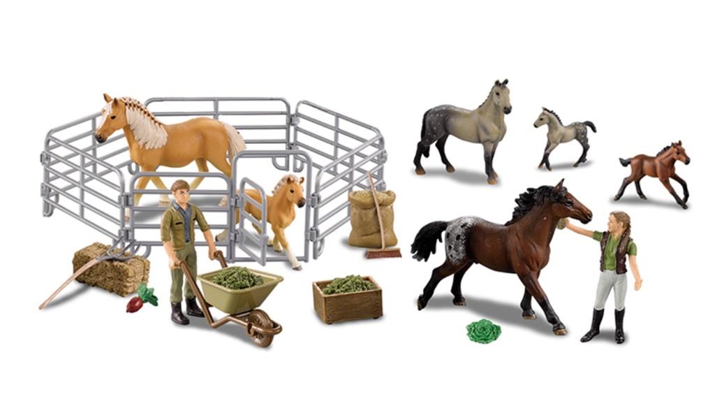 4 WZORY, W ZESTAWIE: 2 KONIE, FIGURKA ROLNIKA, ZAGRODA, AKCESORIA, WYM. OPK: 27 X 18 X 7 CM., 3+