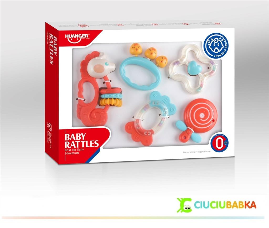 zestaw 5 grzechotek - gryzaków dla najmłodszych , elementy są wykonane z silikonu i plastiku.