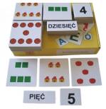 Zestaw ten służy do kształtowania pojęcia równoliczności zbiorów, pojęcia liczby, nauki czytania pełnymi wyrazami (czytanie globalne) liczebników głównych, oraz zaznajomienie się z cyframi.