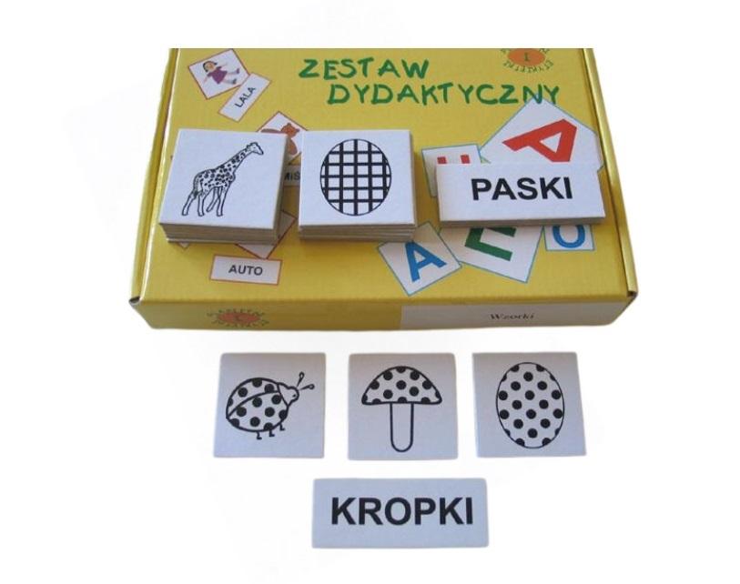 Zestaw plakietek i etykietek służy do przenoszenia obrazów z rzeczywistości na obrazki, uswiadamianiu dziecku, że słowo (napis) oznacza konkretną rzecz, czynność czy sytuację oraz do nauki czytania. Uczy dziecko rozumienia pytań oraz udzielania odpowiedzi.Zestaw ten służy do nauki identyfikacji takiego samego wzoru z pominięciem kształtu wypełnionego tym wzorem oraz nauki wypełniania wzorem dowolnych figur. Nauki odpowiedzi na pytanie: Jaki to wzór? Zestaw zawiera: