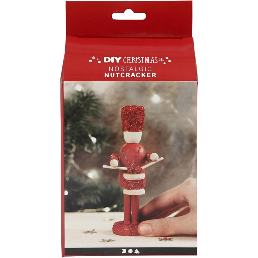 Zestaw ze wszystkimi materiałami potrzebnymi do stworzenia figurki dziadka do orzechów -zawiera: 1 drewniana figura, 1 bęben z 2 pałkami drewna, 20 ml czerwonej farby rzemieślniczej, pędzel, 5 g czerwonego brokatu, 5 ml kleju