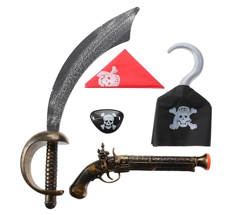 ZESTAW DZIELNY PIRAT (Z HAKIEM) W skład zestawu wchodzą: szabla, pistolet, hak, opaska na oko, bandana Długość szabli: 48 cm Długość pistoletu: 28 cm Długość haka (z materiałem): 23 cm Materiał: plastik
