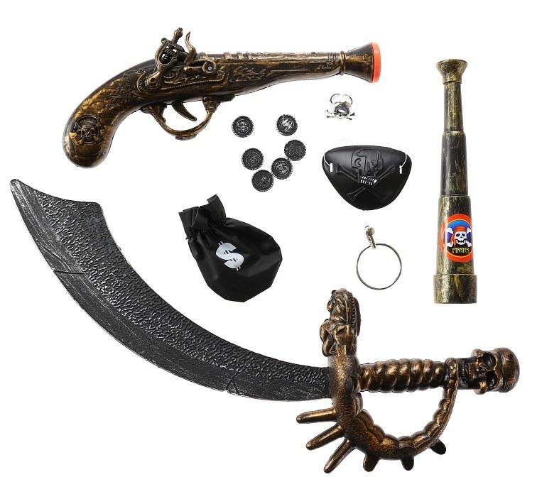 ZESTAW DZIELNY PIRAT (Z LUNETĄ) W skład zestawu wchodzą: szabla, pistolet, luneta, opaska na oczy, srebrny pierścionek z czaszką, duży okrągły kolczyk, worek monet Długość szabli: 47 cm Długość pistoletu: 29 cm Długość lunety: 10 cm Materiał: plastik