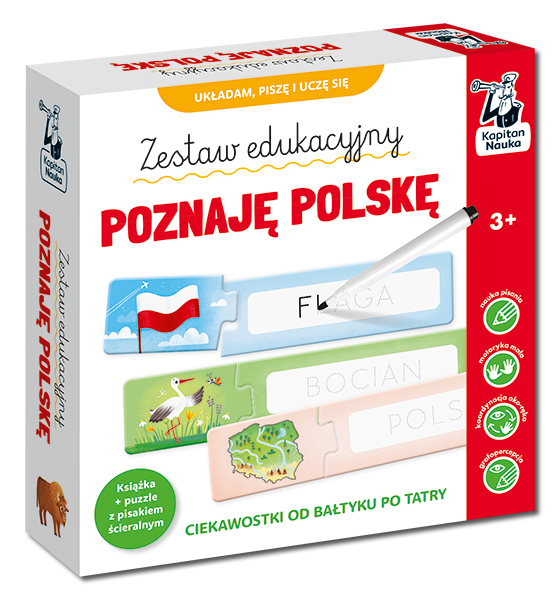 Zestaw przybliża dzieciom hasła i symbole wiążące się z naszą ojczyzną. Książka z różnorodnymi łamigłówkami i pomysłami na zabawy zachęca do poznawania Polski, a dołączone do zestawu puzzle pozwalają rozwijać sprawność grafomotoryczną. W czasie zabawy dziecko nie tylko łączy elementy, lecz także poprawia pisakiem nowo poznane słowa. Ścieralna powierzchnia puzzli umożliwia wielokrotne próby i doskonalenie pisania. Barwne ilustracje zachęcają do zabawy i rozbudzają ciekawość, a umieszczone na rewersie ciekawostki pomagają lepiej poznać geografię Polski, polskie symbole narodowe i tradycje.