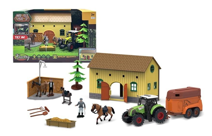 W zestawie: stajnia, traktor, przyczepa do przewozu zwierząt, 2 figurki farmerów, dwa konie, stanowisko do mycia koni, koryto na siano/słomę, widły, grabie, łopata, drzewo, stojak na siodło; funkcje: efekty świetlne i dźwiękowe przy traktorze; baterie: 3 x AG13 dołączone; 3+