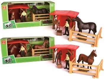 W zestawie: figurka rolnika, 2 figurki koni, siano, koryto, zagroda z 2 płotkami, wys. figurki 9 cm, wym. opak. 34 x 14 x 15 cm, 3+