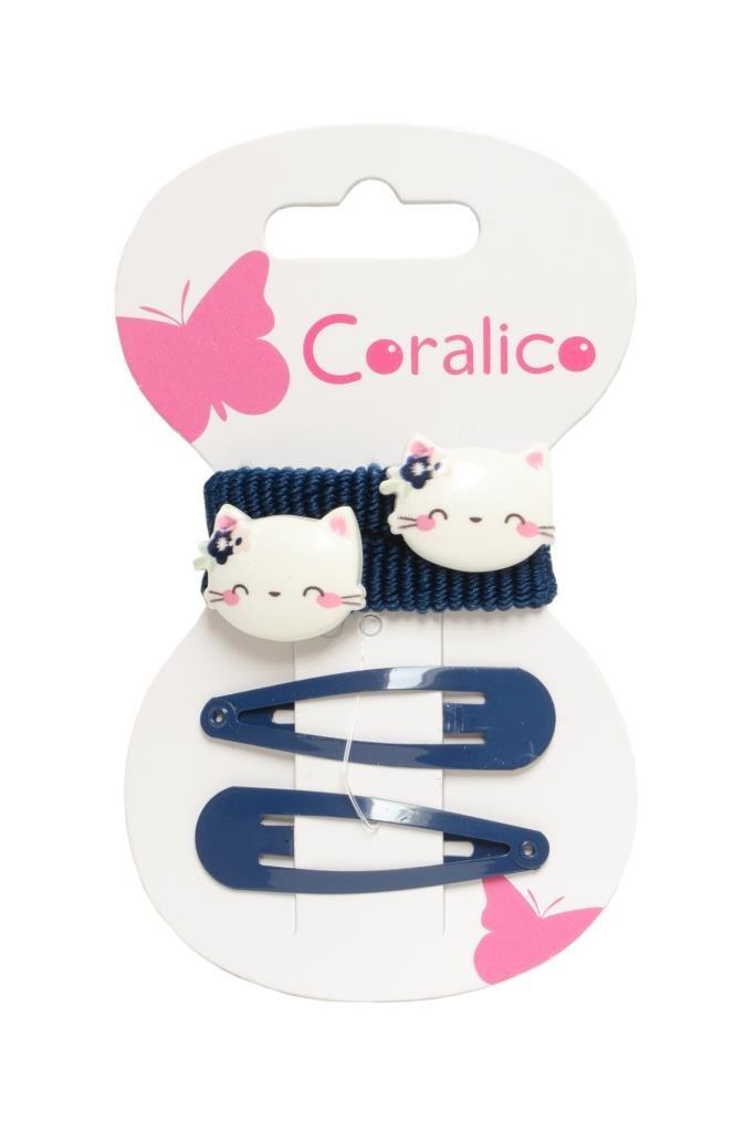 Zestaw granatowych frotek z motywem kotka w kolorze białym i granatowe spinki.