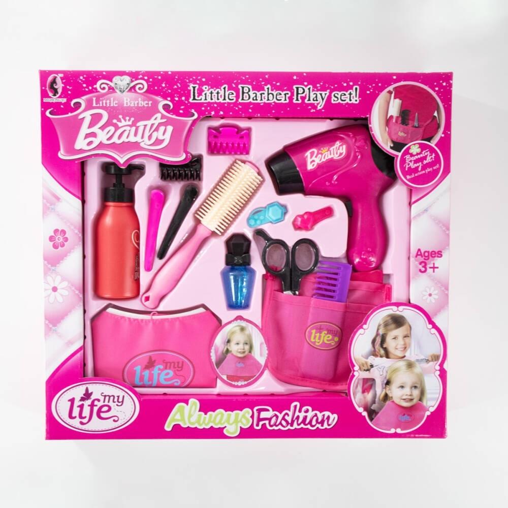 Zestaw fryzjer, salon piękności, który zawiera: suszarkę na baterie, 6 spinek, szczotkę, grzebyk, nożyczki, pas fryzjerski, szampon. Produkt potrzebuje baterii 1 x "AA" - w zestawie brak. Zabawka przeznaczona dla dzieci powyżej 3 roku życia.