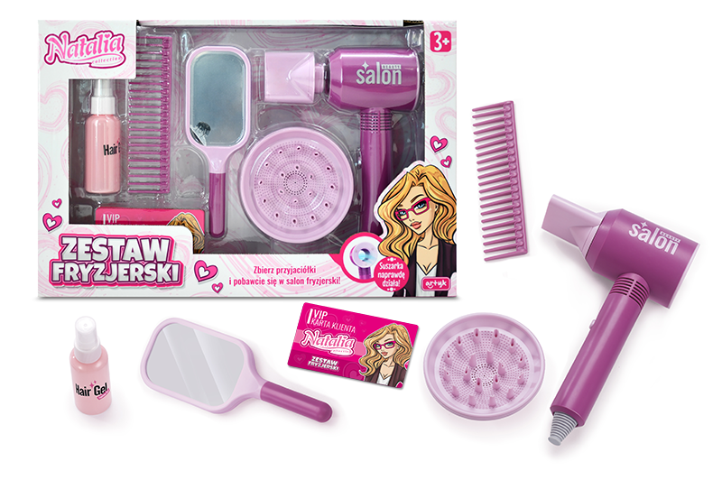 W zestawie: suszarka, 2 końcówki do suszarki, lusterko, grzebień, buteleczka z pompką, 2 karty klienta VIP,