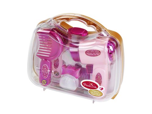 Klein 5273 Zestaw fryzjerski w walizce Princess Coralie Kolekcja Princess Coralie jest autorską kolekcją marki Klein. Skierowana do dziewczynek, oferuje szeroką gamę produktów doskonale uzupełniających się na wzajem. Podczas zabawy dzieci mogą naśladować zaobserwowane w świecie dorosłych sytuacje. Zamknięte w wygodnej, złoto-transparentnej walizeczce akcesoria do pielęgnacji włosów stanową doskonały zestaw do zabawy we fryzjera. Suszarka działa na baterie - po wciśnięciu przycisku dmucha powietrzem, nie nagrzewając się. Szczotka do włosów i grzebień pozwolą doskonale wymodelować fryzurę, a spinka i ozdobny grzebyk pomogą pięknie ją ułożyć. Świetna zabawa gwarantowana. W zestawie znajdują się: - suszarka do włosów; - grzebień; - szczotka; - lusterko; - grzebień ozdobny; - pojemniczek imitujący krem; - flakonik perfum (imitacja) Wymiary opakowania: 21,5x19x8,5cm Wiek: od 3 lat
