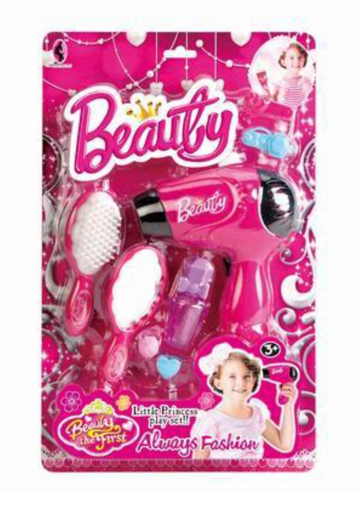 Zestaw fryzjerskich akcesoriów: suszarka, lusterko, szczotka, flakonik.