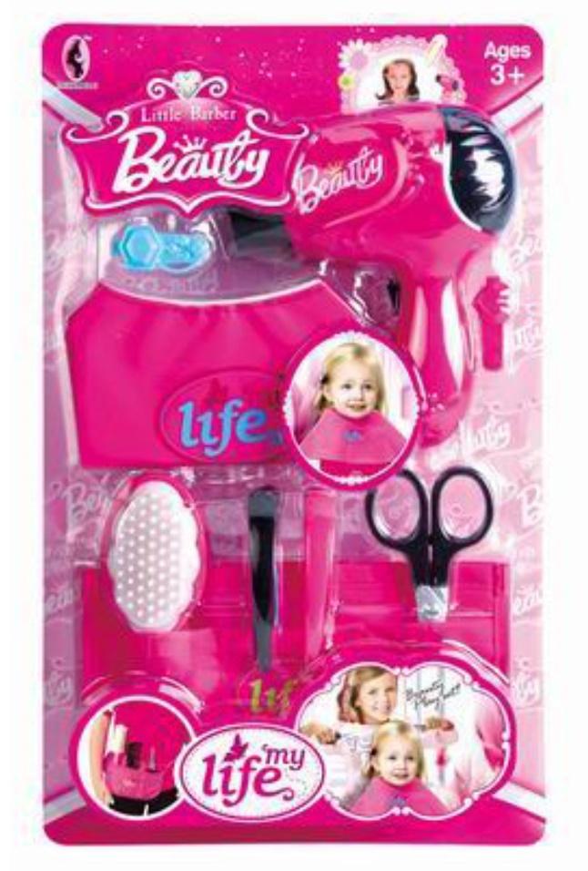 Zestaw fryzjerskich akcesoriów: suszarka, szczotka, nozyczki, spinki, pas na narzędzia.
