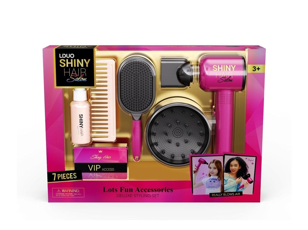 W zestawie: suszarka na baterie, 2 wymienne końcówki, szczotka, grzebień, szampon, karta vip, funkcje: łagodny nawiew powietrza, 3+