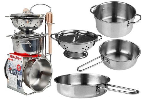 Wieloelementowy zestaw akcesoriów kuchennych Zabawa z dom jest jedną z najpopularniejszych rozrywek zauważalnych wśród dzieci. Pozwala na tworzenie przeróżnych, oryginalnych scenariuszy - dzieci mogą wcielać się w wybrane przez siebie role, do czego potrzebują przeróżnych akcesoriów ułatwiających zabawę. W zbiorach dzieciaków znajdują się między innymi kuchnie, naczynia, sztućce i artykuły spożywcze. Prezentowany przez nas zestaw składa się z błyszczącej, metalowej, srebrnej zastawy, w skład której wchodzą między innymi garnek, patelnie czy cedzak. Mnogość elementów pozwala na wesołą zabawę, podczas której maluchy mogą udawać, że przygotowują wyśmienite potrawy, a także serwować je swoim rodzicom, a także misiom i lalkom. W zestawie znajdują się: - cedzak - garnek - patelnia do grillowania, - patelnia, - drewniana łyżka i widelec - Stojak na naczynia Wszelkie produkty rozmiarem dostosowane są do wymiarów rączek małych dzieci. Elementy te są bardzo lekkie, dzięki czemu zabawa nie będzie sprawiać maluchom najmniejszego kłopotu. Kolorystyka wszystkich elementów zestawu nawiązuje do ich realnych odpowiedników, co z pewnością przyciągnie wzrok każdego małego kucharza. Bezpieczna konstrukcja naczyń i jedzenia jest gwarancją bezpieczeństwa płynącego z zabawy. Wszelkie elementy wykonane są z bezpiecznych materiałów. Zestaw jest zgodny z normą EN 71. Przeznaczony jest dla dzieci powyżej 3. roku życia. Zestaw akcesoriów kuchennych ustawiony jest na przeznaczonym dla nich stojaku. Wymiary wybranych elementów zestawu: - cedzak : 5,5cm x 16cm - garnek: 5,5cm x 16cm - patelnia: 5,5cm x 20cm - Wysokość stojaka : 33cm Wymiary opakowania: 16 x 16 x 33 cm