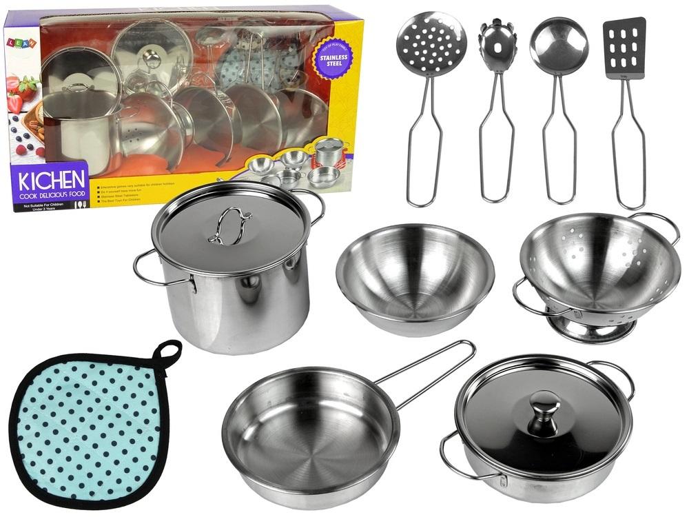 Garnki i sztućce maja kolor metaliczny, który będzie pasował do każdej kuchni i wykonane są ze stali nierdzewnej.