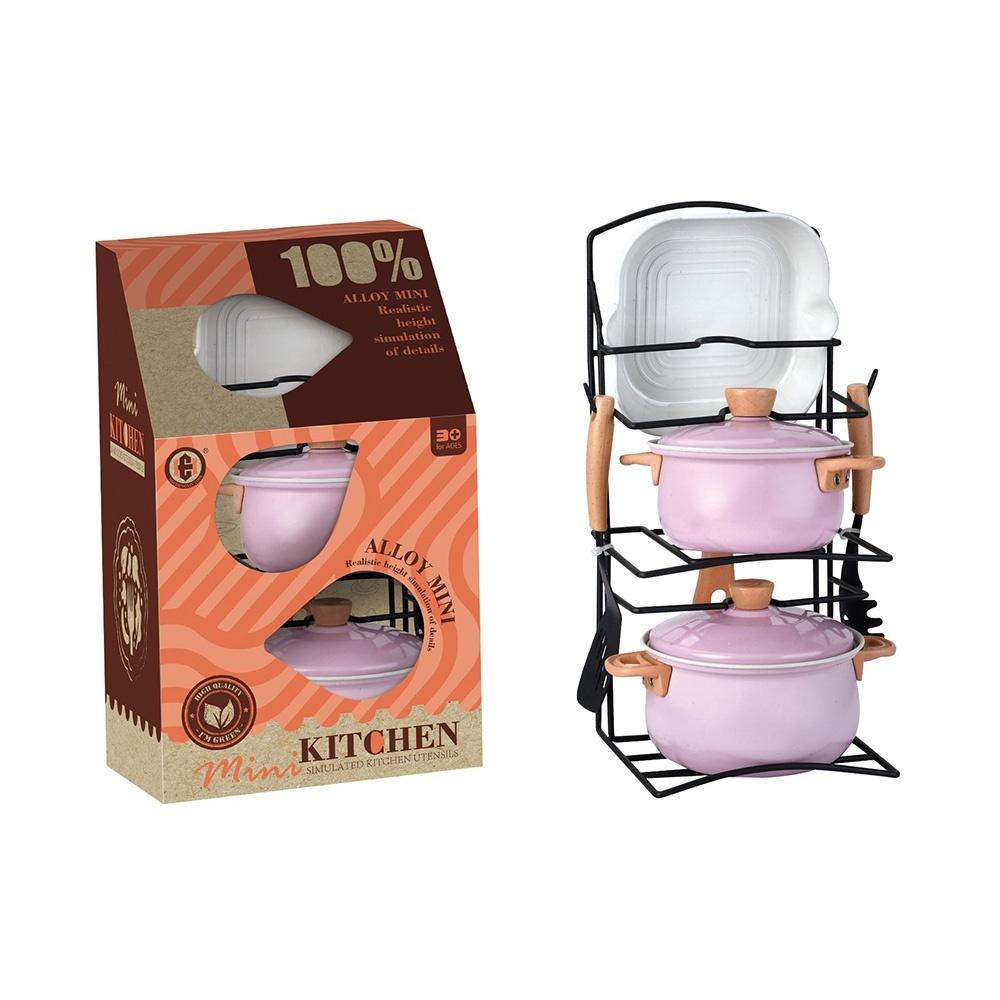 Zestaw metalowych garnków na stojaku - 9 elementów Wymiary opakowania: 15,5x23,2x25,5 cm Wiek 3+