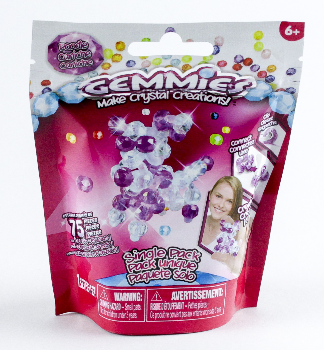 Pojedyncze zestawy Gemmies zawierają ponad 75 elementów, dzięki którym stworzysz figurkę 3D pieska, pingwina, ważki lub kwiatka.