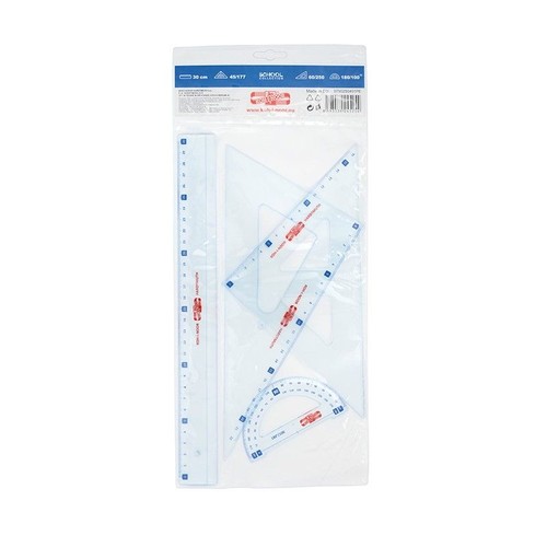 Zestaw zawiera: - Linijkę 30 cm - Ekierkę równoramienną 16 cm - Ekierkę prostokątną 22 cm - Kątomierz 180