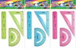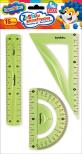 Zestaw przydatny w szkole, w szczególności na zajęciach matematycznych. W skład zestawu wchodzą: linijka, ekierka, kątomierz. Produkty zostały wykonane ze specjalnego materiału odpornego na złamanie. Linijka 15 cm Ekierka 14 cm Kątomierz