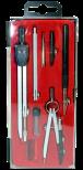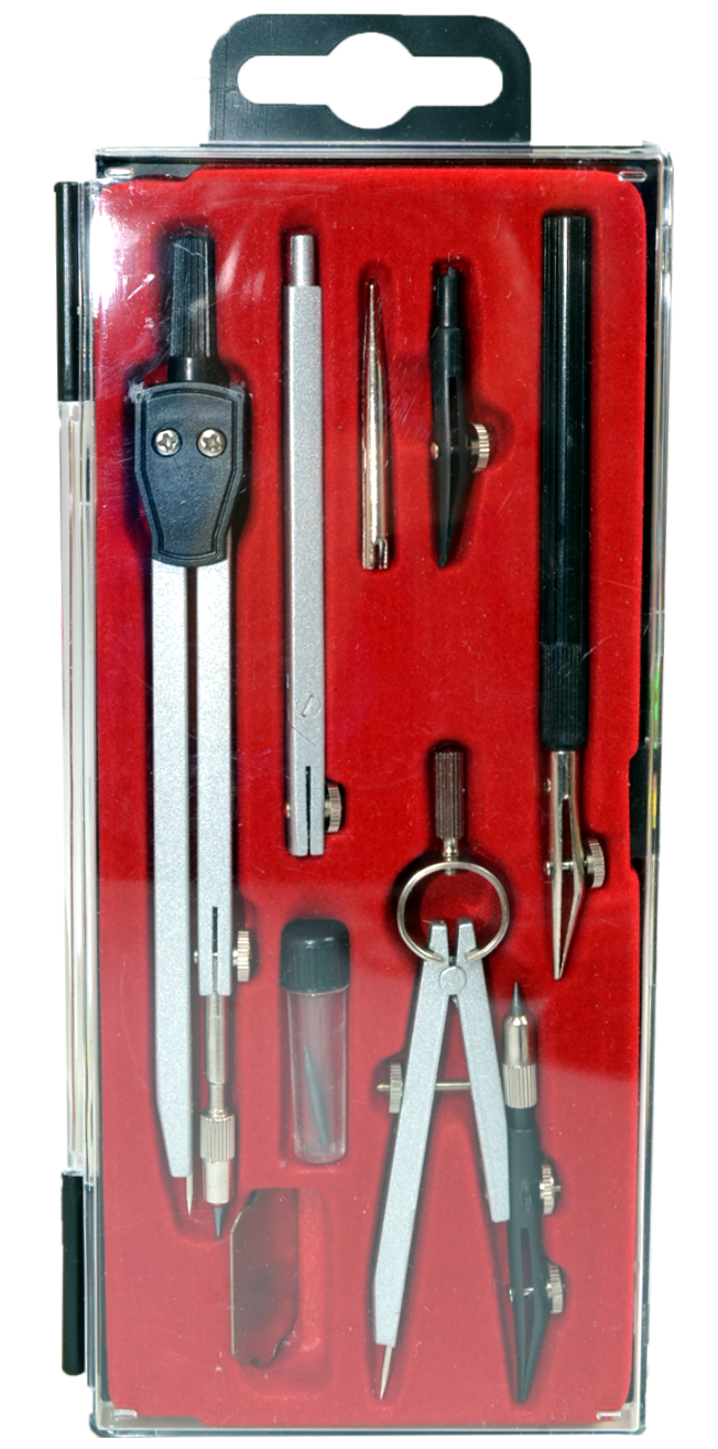 Zestaw cyrkli szkolnych w rozmiarze średnim. Zawiera cyrkiel zwykły i cyrkiel precyzyjny oraz przedłużacz do kreślenia dużych łuków lub okręgów. W komplecie zapasowy grafit oraz grafion wraz z częściami zamiennymi. Całość w trwałym plastikowym etui.