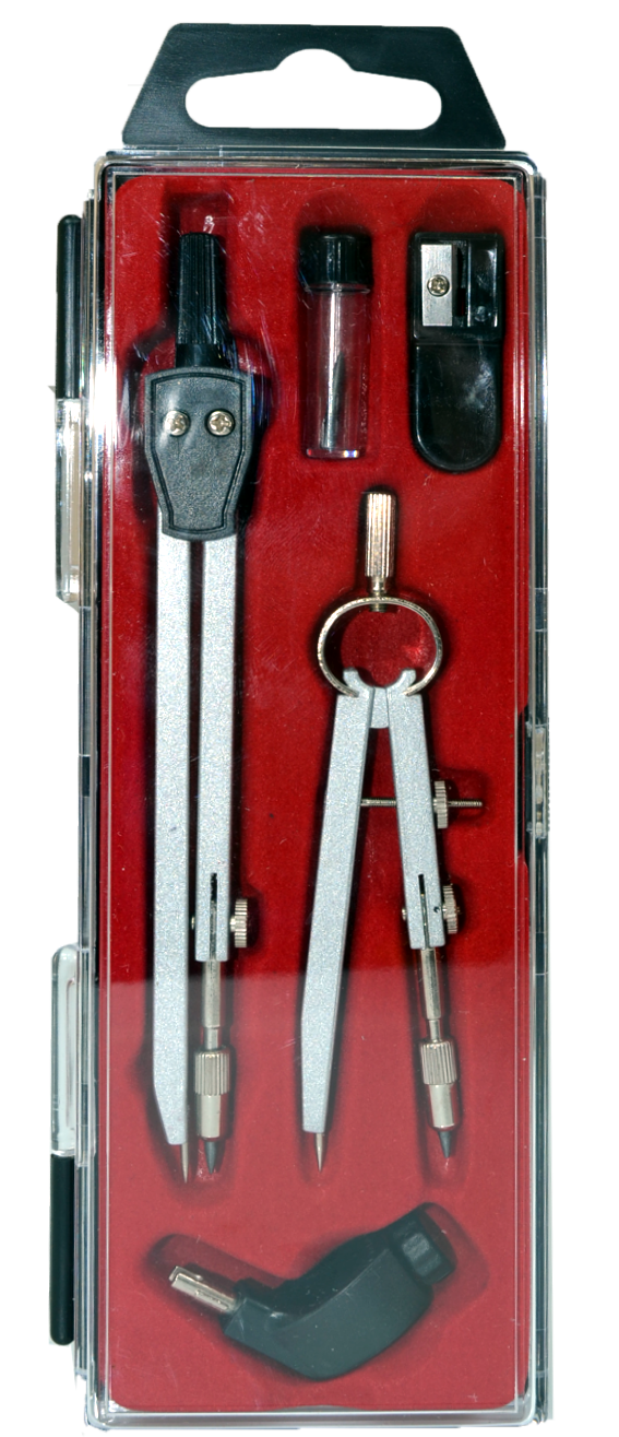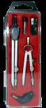 Zestaw cyrkli szkolnych zwierający: składany cyrkiel zwykły i cyrkiel precyzyjny, zapasowy grafit, temperówkę oraz koncówkę do rapidografów. Całość w trwałym plastikowym etui.