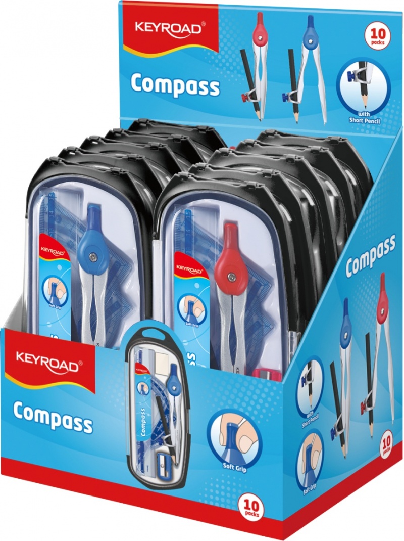 • składa się z 8 elementów: cyrkla, gumki do ścierania, temperówki, kątomierza, linijki 15cm, ekierek 45° i 60° oraz czarnego ołówka