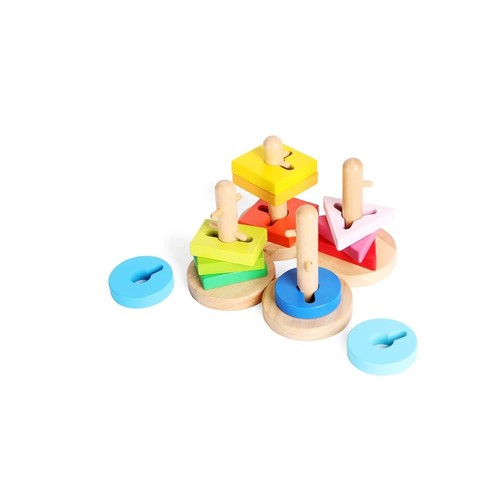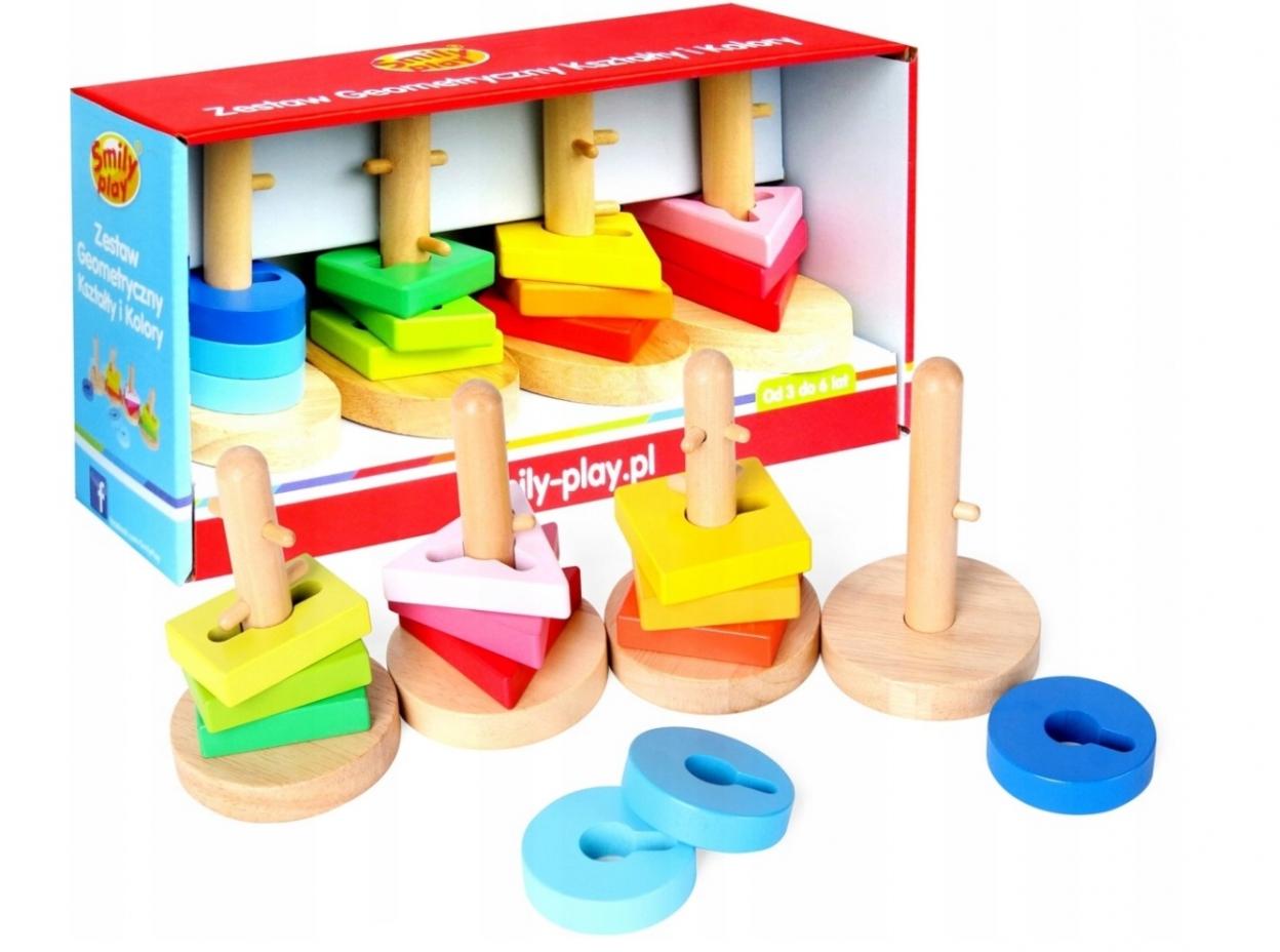 Zestaw Geometryczny to drewniana zabawka która rozwija sprawne rączki, koordynację wzrokowo-ruchową i wyobraźnię przestrzenną. Układanka składa się z 12 kolorowych elementów w różnych kształtach i kolorach. Na 4 podstawkach układanki trzeba umieścić odpowiednie kształty: trójkąty, koła, kwadraty lub prostokąty. Zabawka rozwija kreatywność, zdolności manualne, wyostrza zmysł koncentracji oraz uczy rozróżniania kształtów i kolorów. Wspomaga rozwój: małej motoryki, koordynacji oko ? ręka, logicznego myślenia.