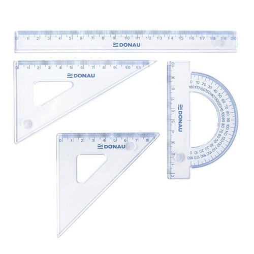 zestaw geometryczny przydatny dla każdego ucznia wytrzymały, odporny na odkształcenia podziałka zgodna z normami zestaw mały: linijka 20cm, kątomierz, ekierka 10,5cm i ekierka 15cm kolor transparentny