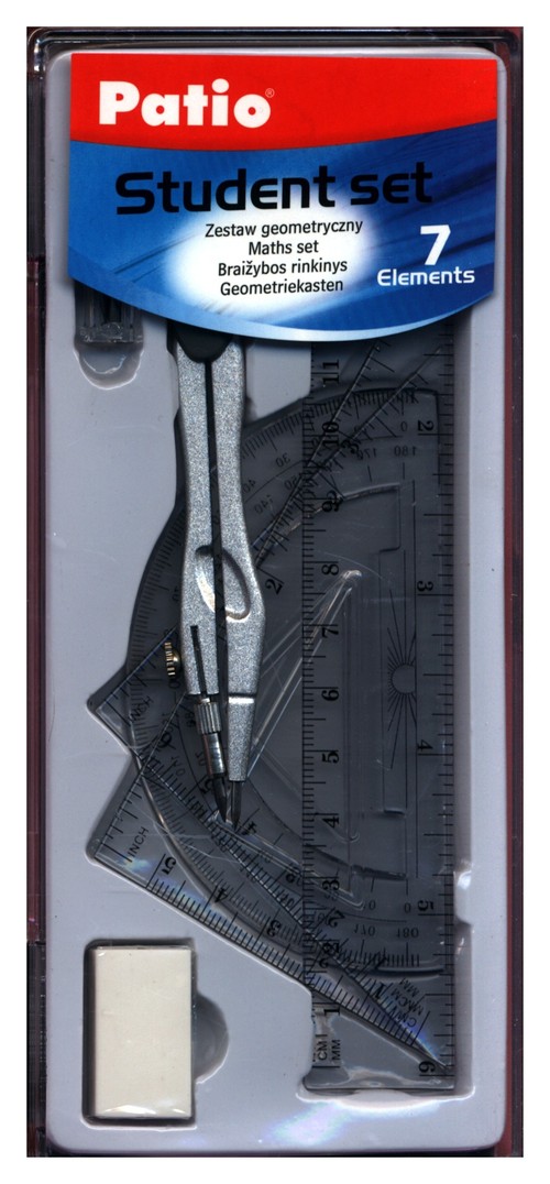 Zestaw geometryczny 7 elementów Cyrkiel Linijka 2 ekierki Kątomierz Gumka Rysiki