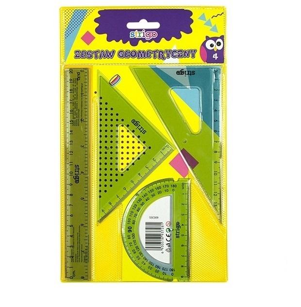 Zestaw geometryczny: linijka 20 cm, ekierka 45 stopni, ekierka 60 stopni, kątomierz 180 stopni.