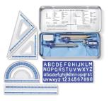 Zestaw w metalowym pudełku zawiera: cyrkiel, 2 ekierki (45 i 30/60), przenośnik, linijkę 15 cm, kątomierz, szablon literowo-cyfrowy, temperówkę, gumkę, mały ołówek do cyrkla
