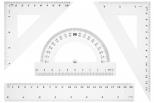 Zawiera: dwie ekierki (14,5 cm, 10,5 cm), linijkę (20 cm), kątomierz (10 cm).