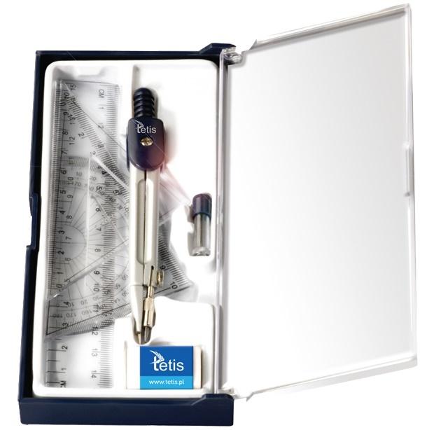 Komplet zawiera: cyrkiel, 2 ekierki, linijkę, kątomierz, gumkę ołówkową oraz zapasowe grafity (2 sztuki). Opakowanie: pudełko 6 kpl.
