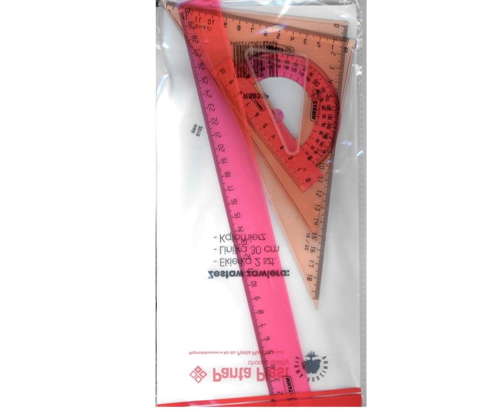 Zestaw geometyczny duży. W zestawie ekierka, 2 sztuki linijek po 30cm, kątomierz.