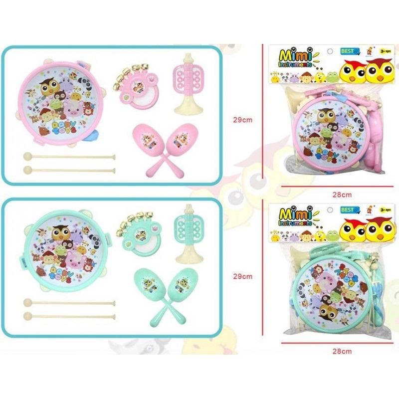 Zestaw instrumentów muzycznych zapakowany w woreczek z papierową pzrywieszką. W skład zestawu wchodzi bębenek z pałeczkami mini trąbka 2szt marakasów i tamburyn.
